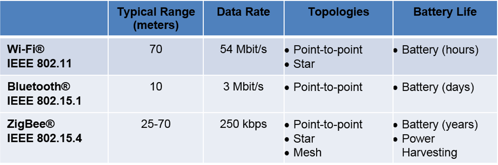 All of the technologies listed in this article are IEEE-based wireless technologies, where the Institute of Electrical and Electronics Engineers (IEEE®) have developed strategies required for IEEE solutions to provide reliable coexistence with Wi-Fi, Bluetooth, and ZigBee devices operating in the same environment.